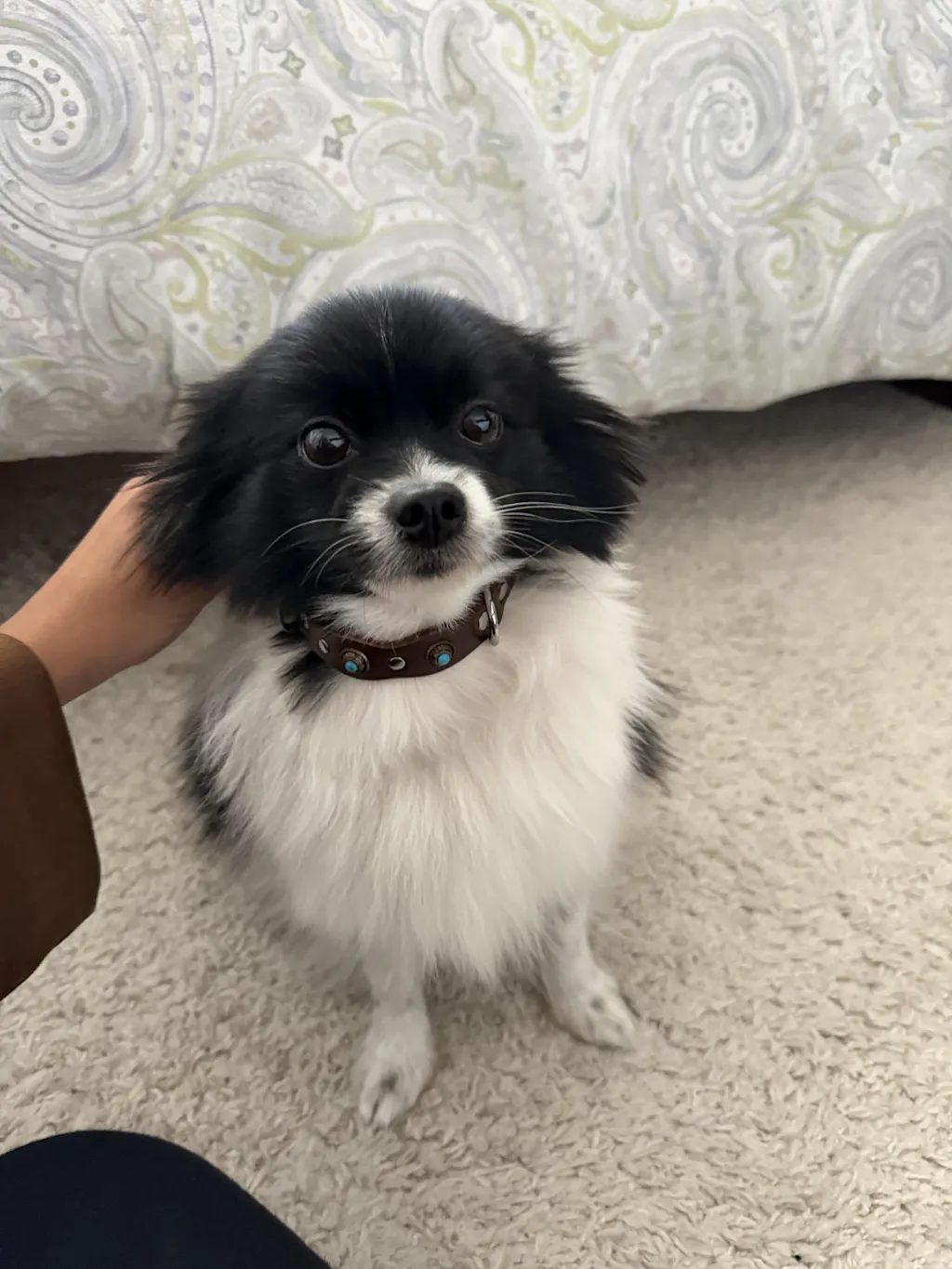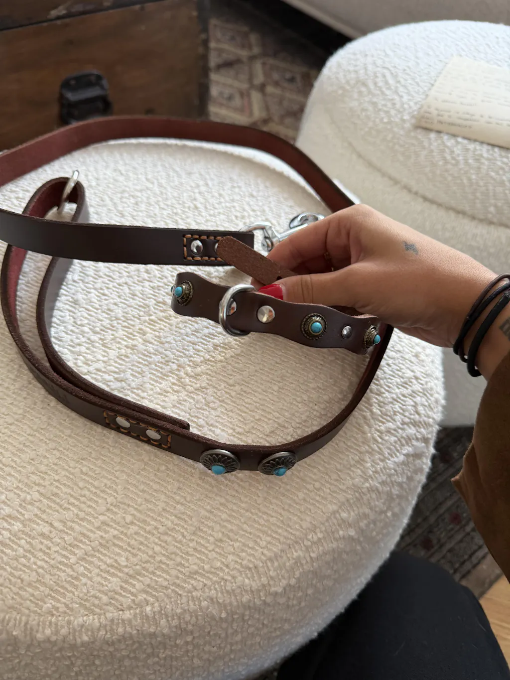 La Correa Terra lleva el estilo del paseo a otro nivel — cuero marrón de tacto suave, tachuelas con un sutil punto azul y herrajes metálicos de alta calidad. Un look vintage con presencia, pensado para durar.